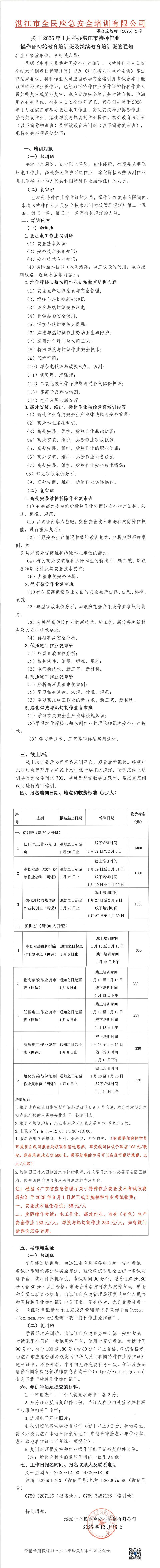 2026年1月高低壓電工作業(yè)、高處安裝維護(hù)拆除作業(yè)、登高架設(shè)作業(yè)、熔化焊接與熱切割作業(yè)初始教育培訓(xùn)班及繼續(xù)教育培訓(xùn)班的通知