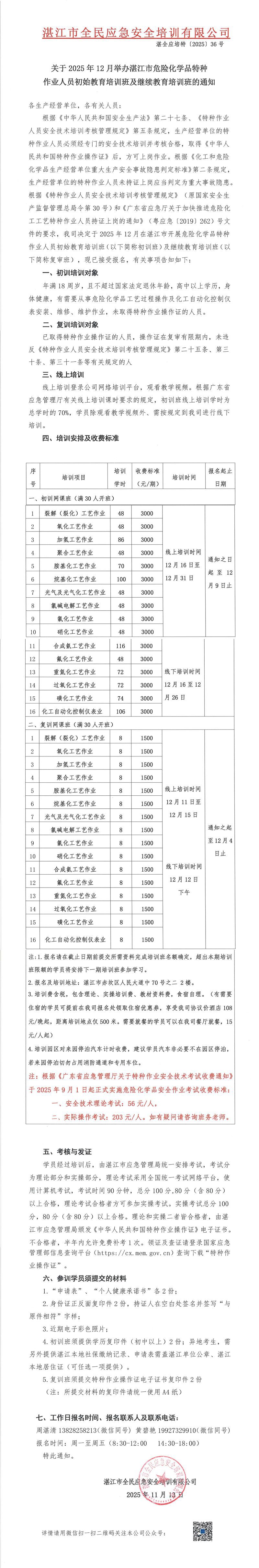 關(guān)于舉辦2025年12月份湛江市危險(xiǎn)化學(xué)品特種作業(yè)初訓(xùn)培訓(xùn)班的通
